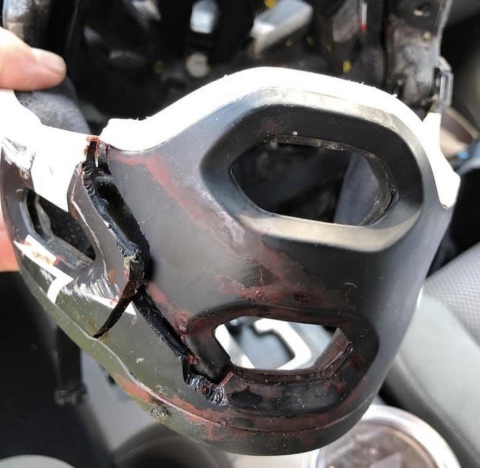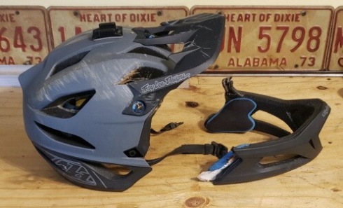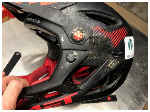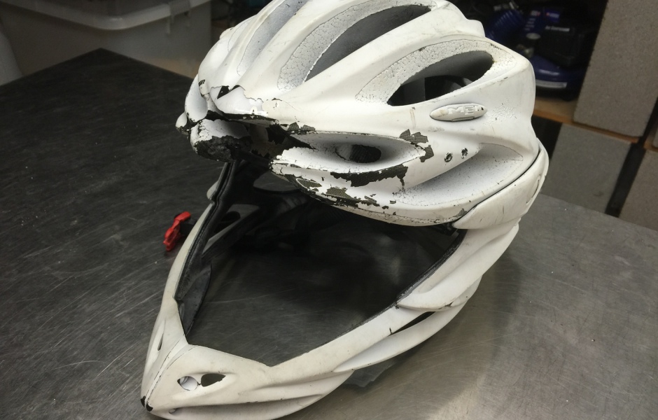 The next picture of the red and black Met is also telling. Had I not had this helmet on, I would have lost the lower part of my cheek, as you can see from how the scratches on the helmet go much lower than what a traditional cross country lid would cover. The helmet is cracked inside (not pictured), so it did its job; thank God. I have more stories than I can count of riders doing well in a crash when they had a helmet with face protection; and, unfortunately, I also have more stories than I can count of riders who did not do well in a crash with a half shell.
